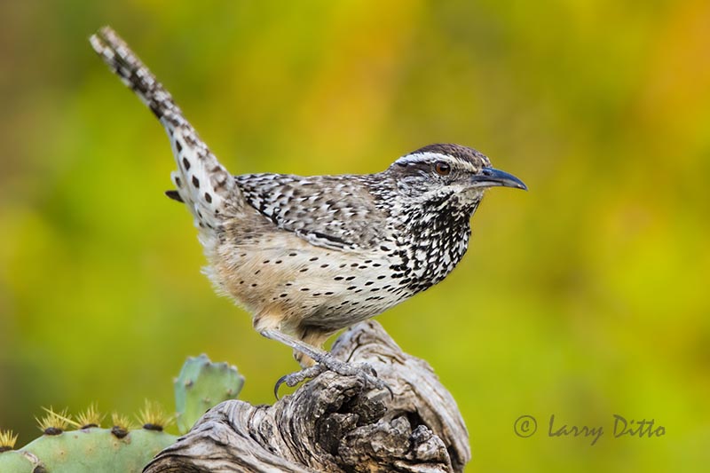 I really liked this wren shot, but should have been shooting at f8 or f11 to bring the tail into focus. On the other hand, that would have brought more detail into the background and I didn’t want that. Unfortunately, this type of pose lasts about 2 seconds, so there is no time to think about “where to focus at f11” and still keep the background blurred. The correct focus point for this shot would probably have been about mid-way up the tail.