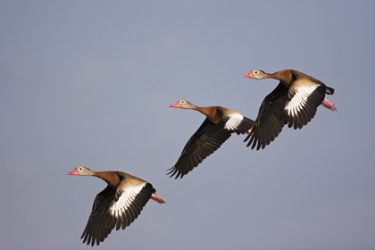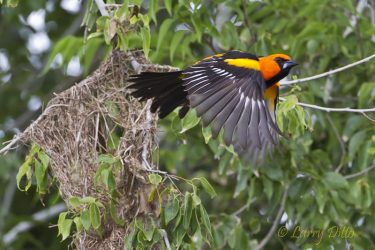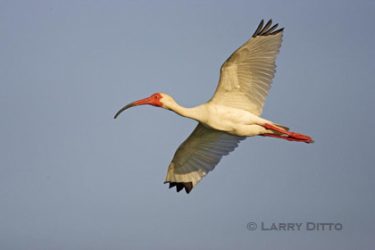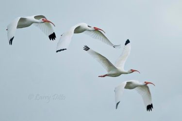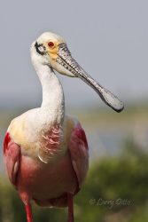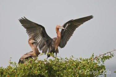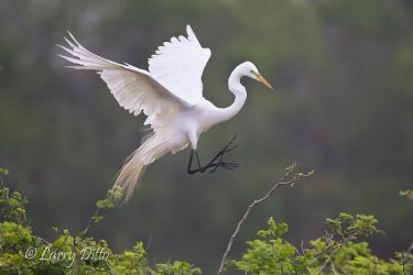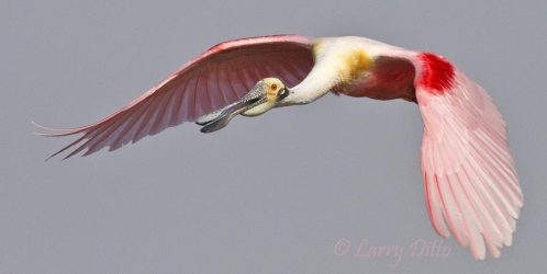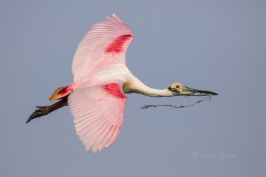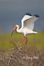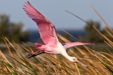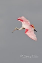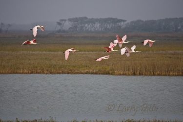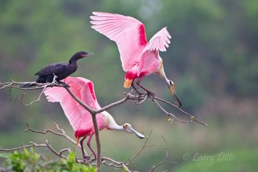 Roseate Spoonbill landing in mesquite trees on National Audubon Society's Green Island Sanctuary in the Laguna Madre, Texas.