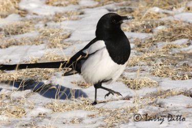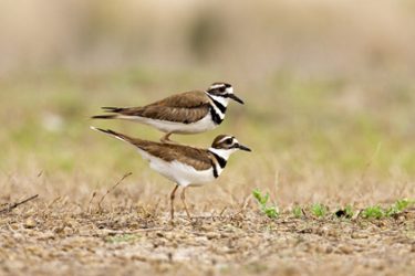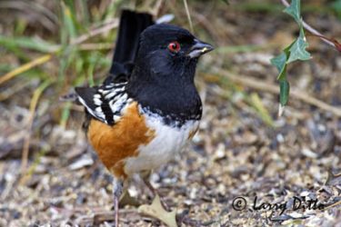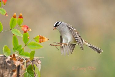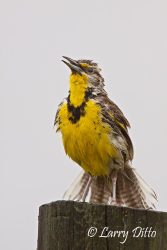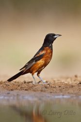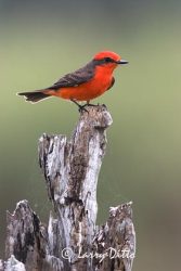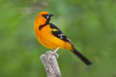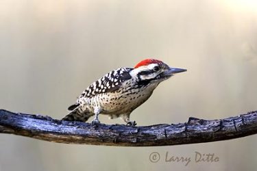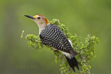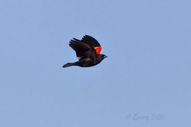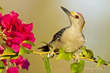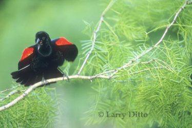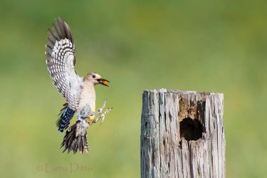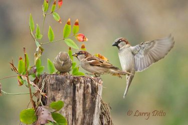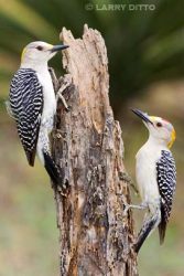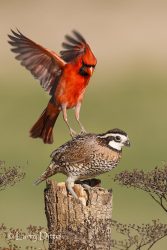Red-winged Blackbird male and Golden-fronted Woodpecker male fighing over position on fence post, south Texas, spring
