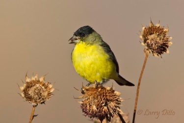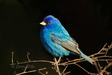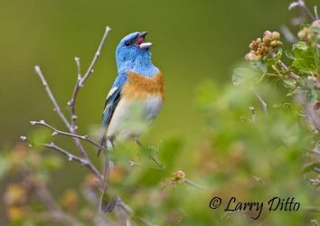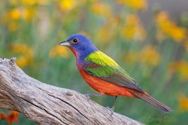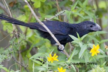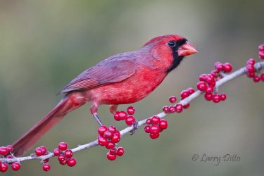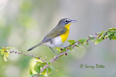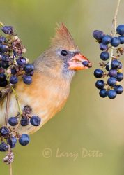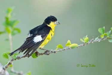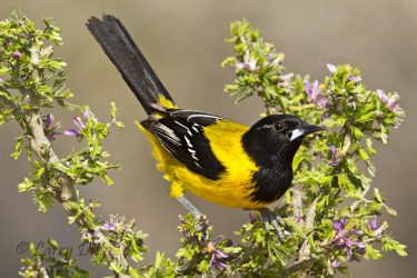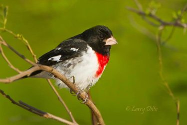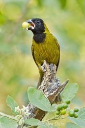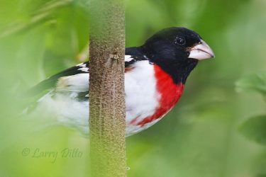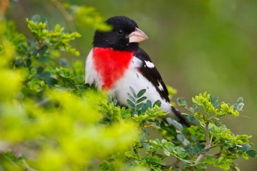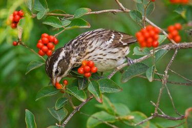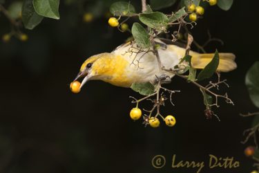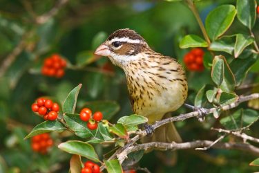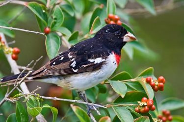 Rose-breasted Grosbeak (Pheucticus ludovicianus) male eating lantana fruits on South Padre Island, Texas during spring migration