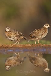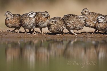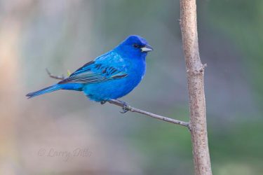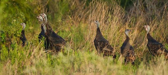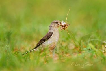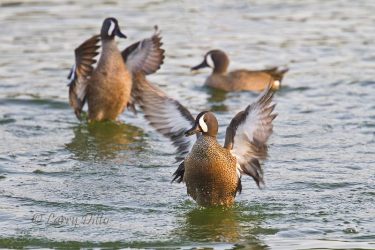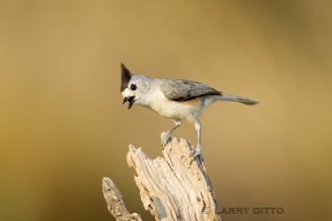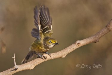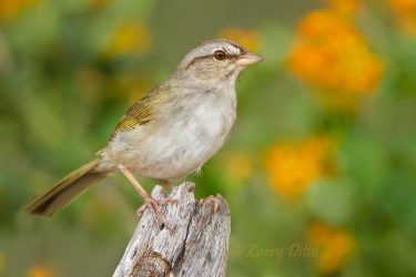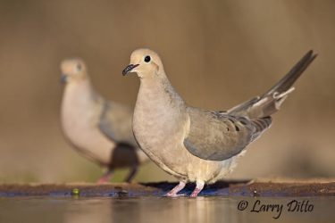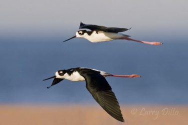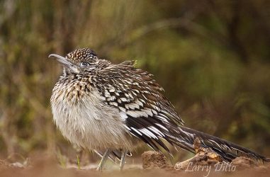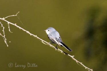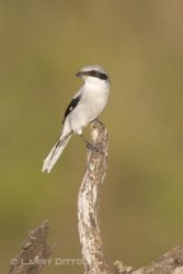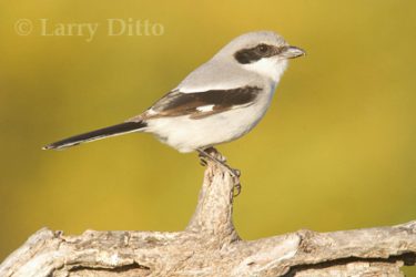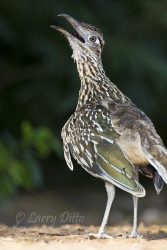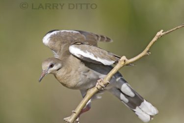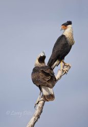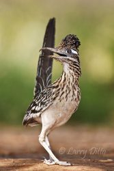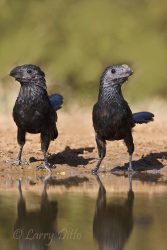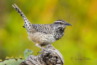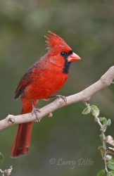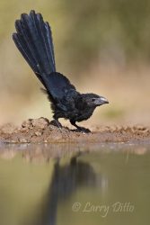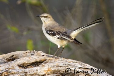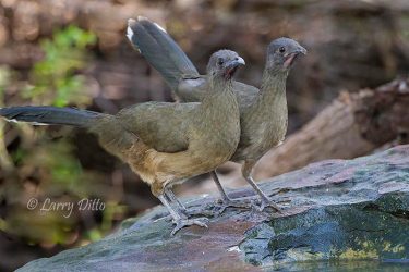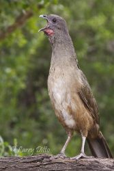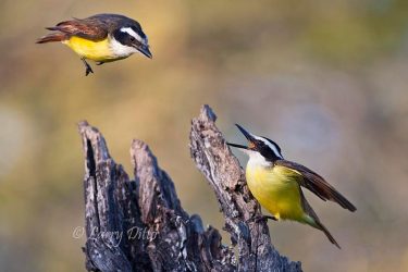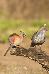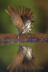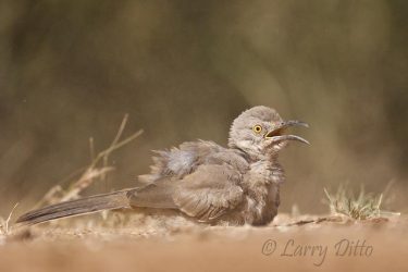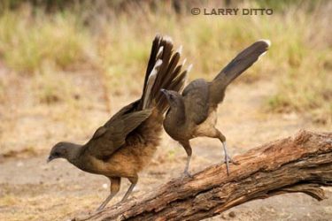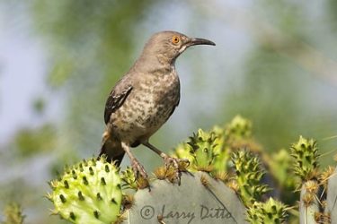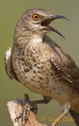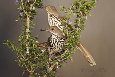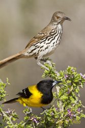 Long-billed Thrasher (Toxostoma longirostre) challenging other birds for its place on the perch, south Texas, late winter