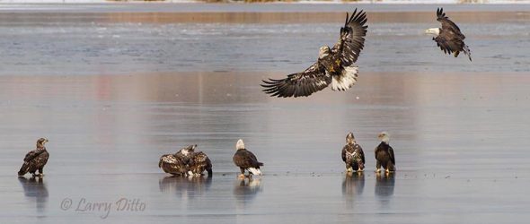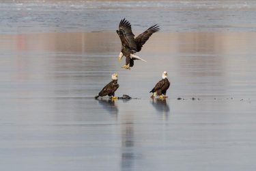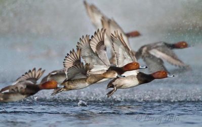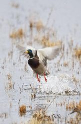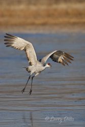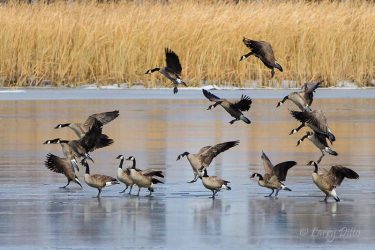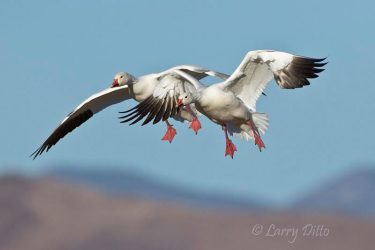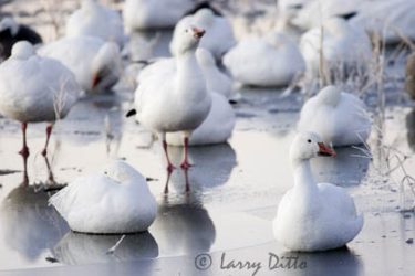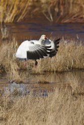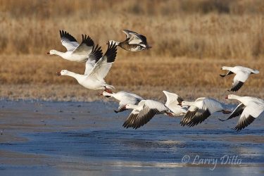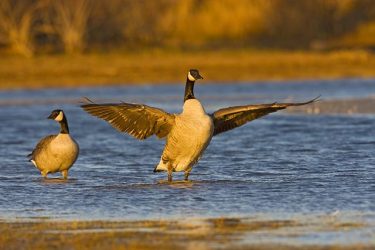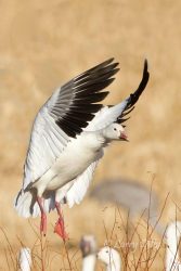 Snow Geese (Chen hyperborea) pair taking off on thin ice, Bosque del Apache NWR, New Mexico, November