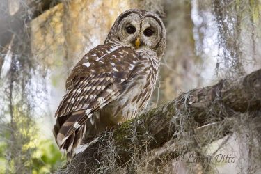 Barred Owl (Stryx varia), adult in old growth eastern U.S. forest with Spanish Moss, Caddo Lake, Texas, spring