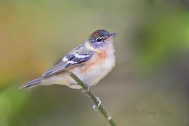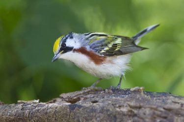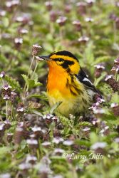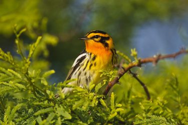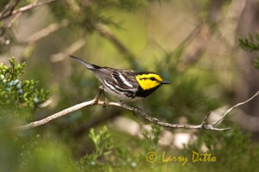 Golden-cheeked Warbler (Dendroica chrysoparia); endangered species; male in breeding territory, Texas hill country west of San Antonio, spring