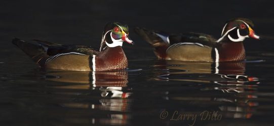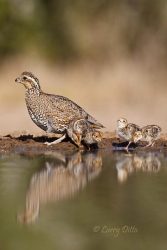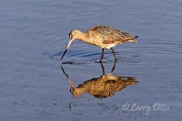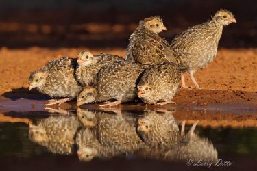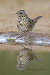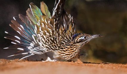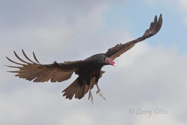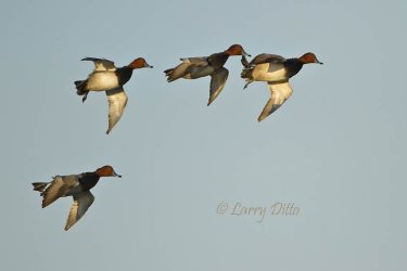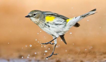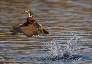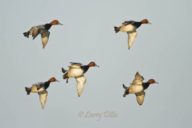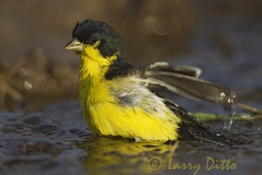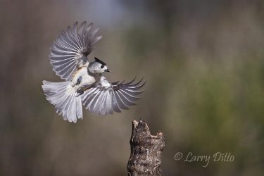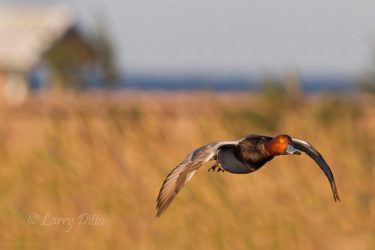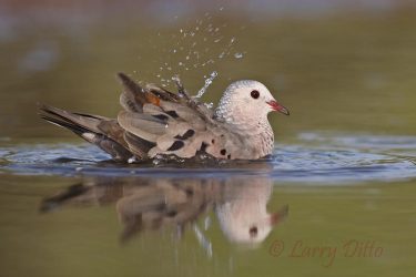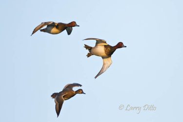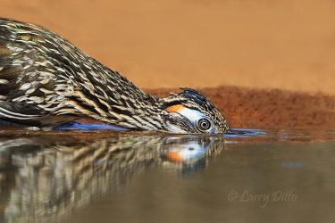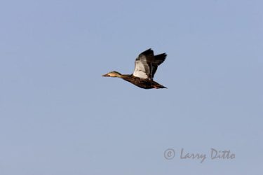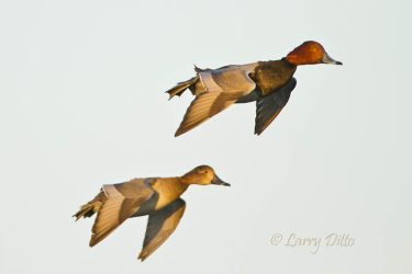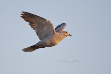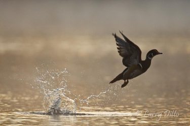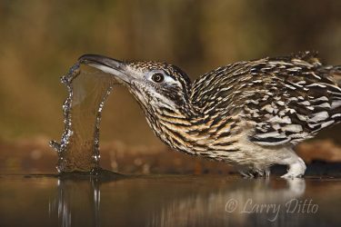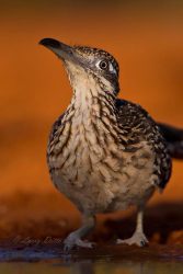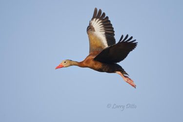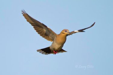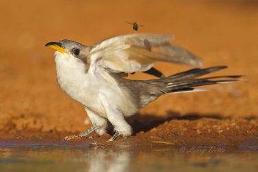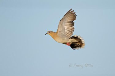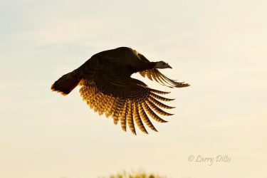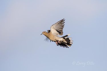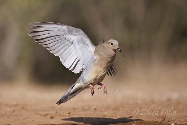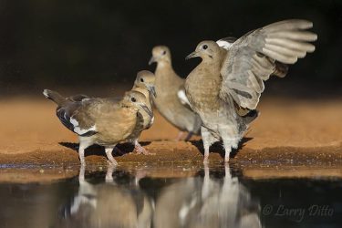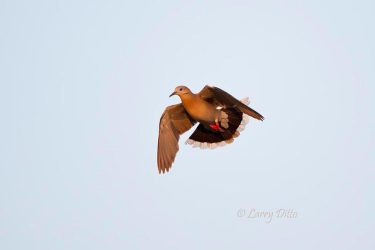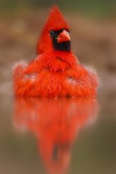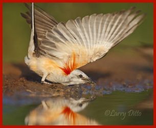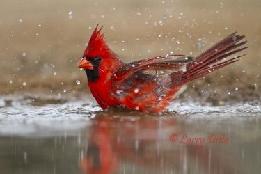 Northern Cardinal (Cardinalis cardinalis) flying from pond where she was drinking, sunset in south Texas, March