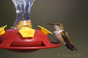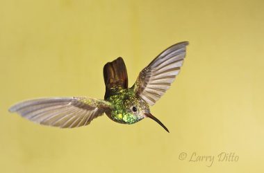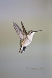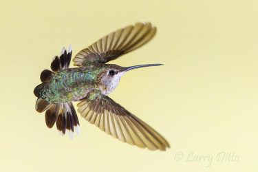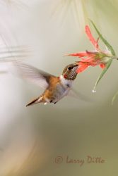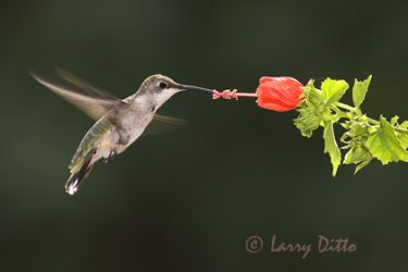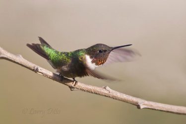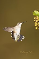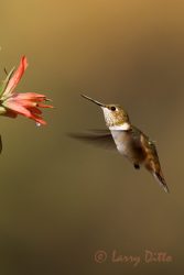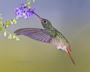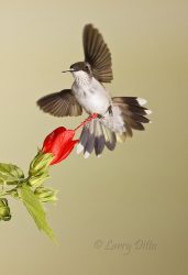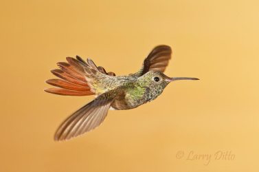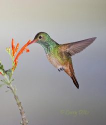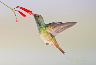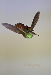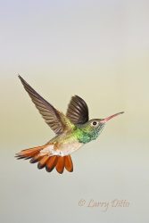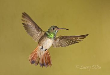 Buff-bellied Hummingbird (Amazilia yucatanensis) adult hovering; species is common resident of the Sabal Palm Sanctuary near Brownsville, Texas