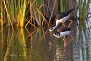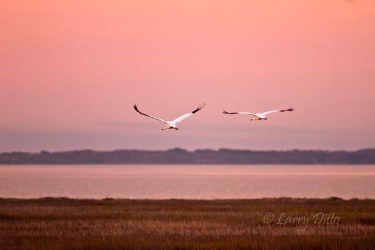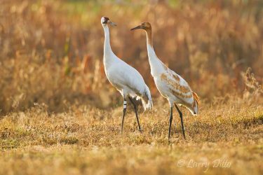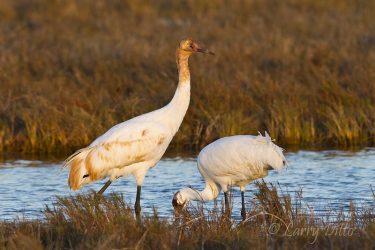 Whooping Cranes (Grus americana) pair feeding in early morning light, Aransas National Wildlife Refuge, Texas