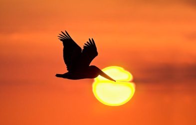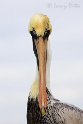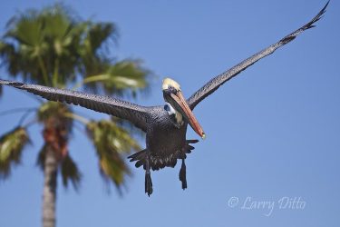 Brown Pelican (Pelecanus occidentalis) in flight, Goose Island State Park, at Rockport, Texas. Rockport motto:"Charm of the Texas coast".