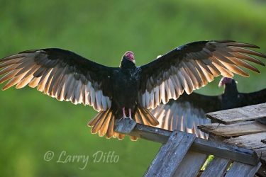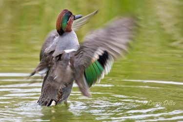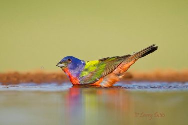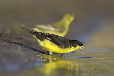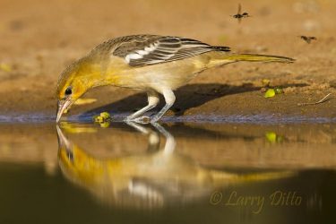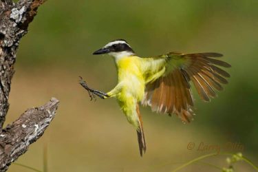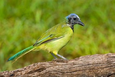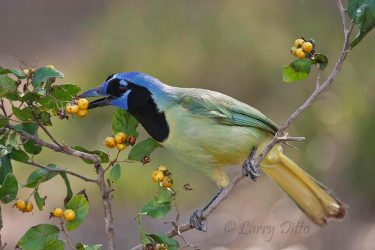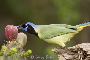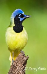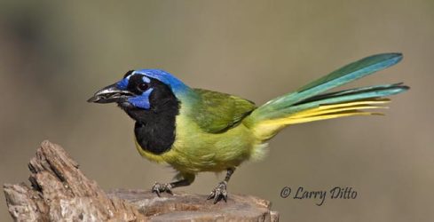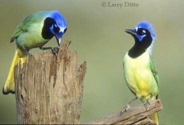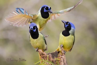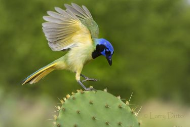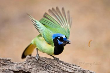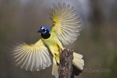 Green Jay (Cyanocorax yncas) frightened away from pond while drinking, sunset in south Texas, spring