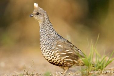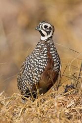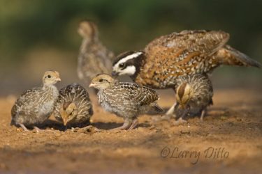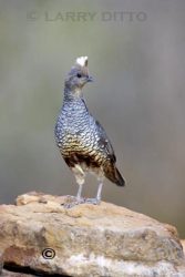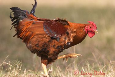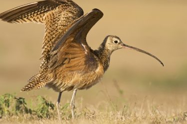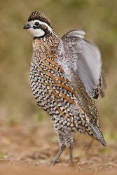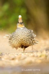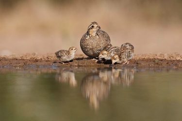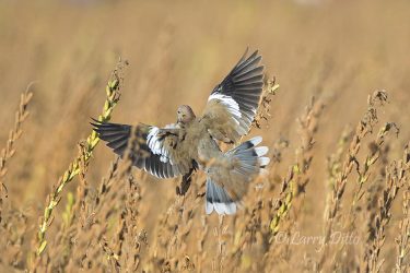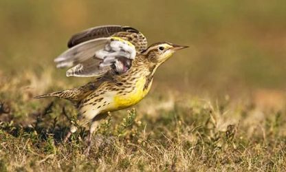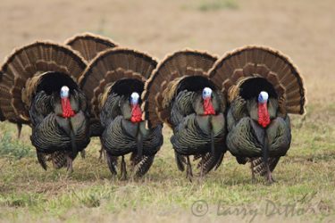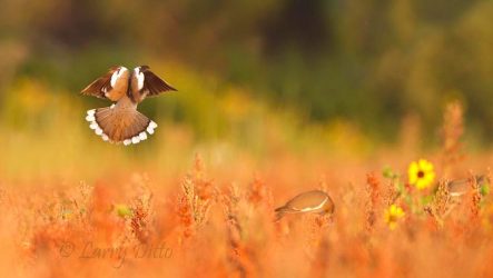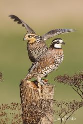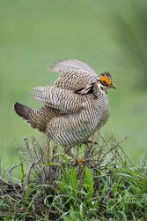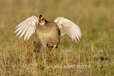 Lesser Prairie Chicken (Typanuchus pallidicinctus) male landing on lek, displaying to females, Canadian, Texas, USA, April