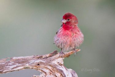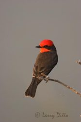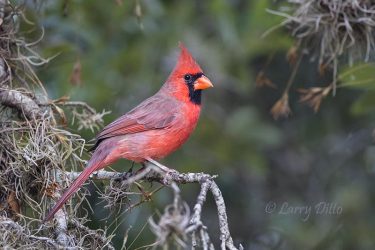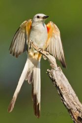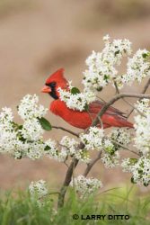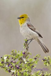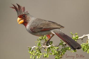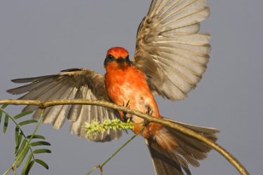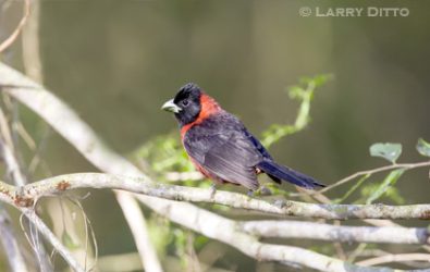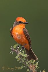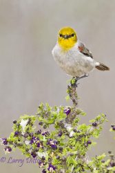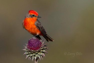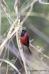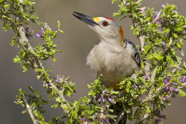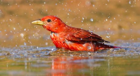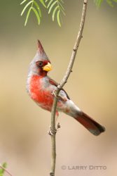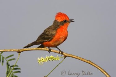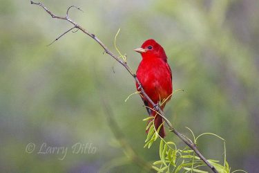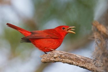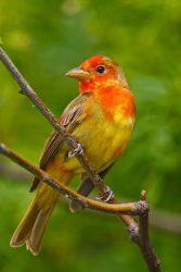 Summer Tanager (Piranga rubra) first year male scolding other birds from blooming Cenizo bush, spring, s. Texas