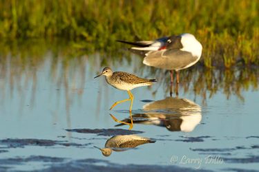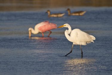 Roseate Spoonbill (Ajaia ajaja) landing near a lesser yellowlegs in the Laguna Madre at sunrise by the South Padre Island World Birding Center, Texas