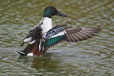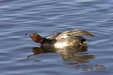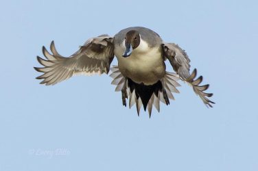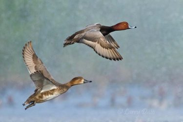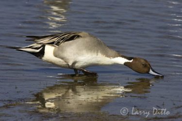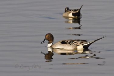 Northern Pintails (Anas acuta) male stretching wings while female sleeps, Laguna Madre, South Padre Island, Texas