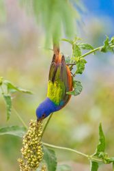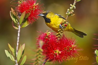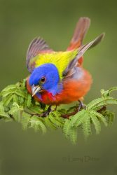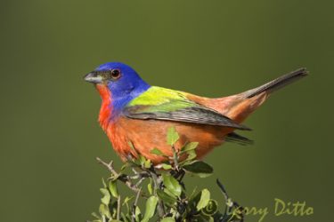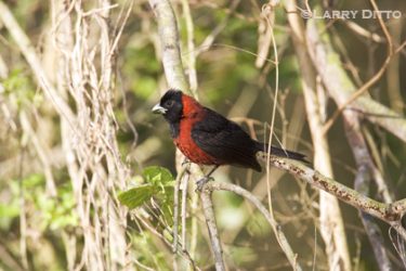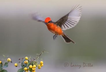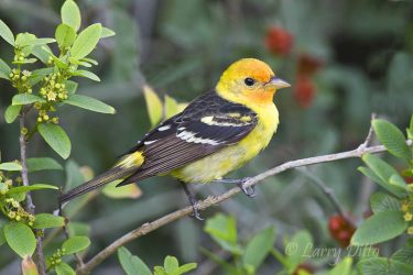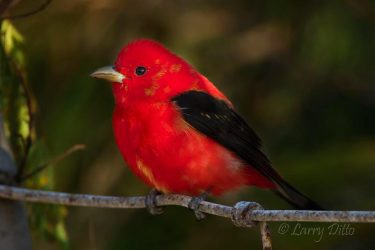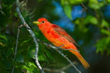 Scarlet Tanager (Pitanga olivacea) male feeding on Lantana berries, spring, South Padre Island, Texas