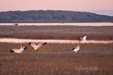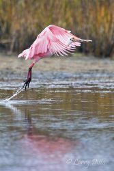 Roseate Spoonbill (Ajaia ajaja) landing on the tidal flats of the Laguna Madre at sunrise by the South Padre Island World Birding Center, Texas