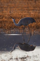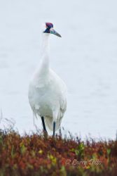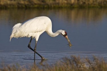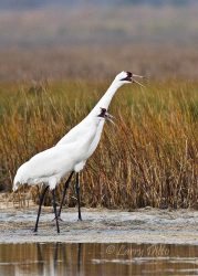 Whooping Cranes (Grus americana) adult and young (rusty) with crab caught in brackish marsh at Aransas National Wildlife Refuge, Texas
