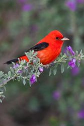 Scarlet Tanager (Piranga olivacea), male perched in blooming Cenizo bush, South Padre Island, Texas, spring migration