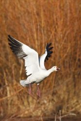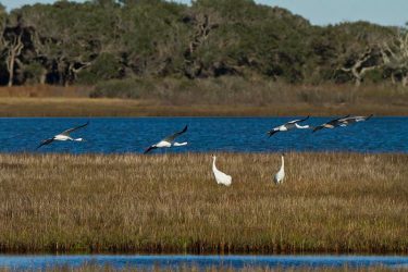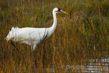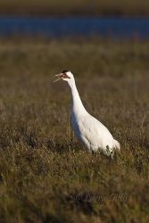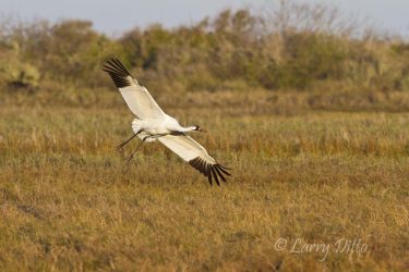 Whooping Crane (Grus americana) adult in flight over marsh at Aransas National Wildlife Refuge, Texas, winter