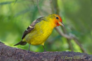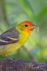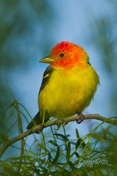 Western Tanager (Piranga olivacea) male perched in fiddlewood, South Padre Island, Texas, spring migration