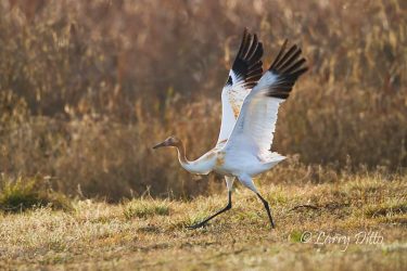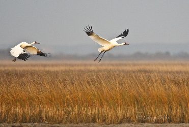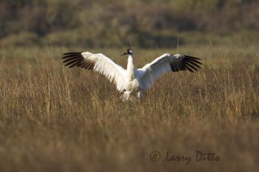Whooping Crane (Grus americana) adult flapping wings as mate approaches, Aransas National Wildlife Refuge, winter