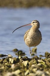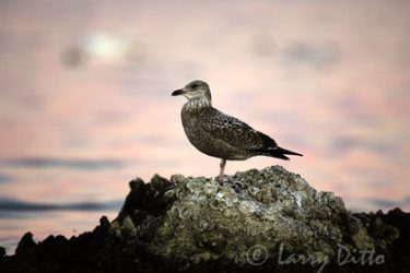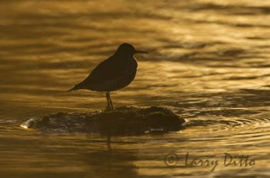 Burrowing Owl (Athene cunicularia) adult perched on large rock amid shadows at sunset, s. Texas, winter.