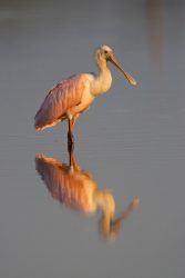 Roseate Spoonbill (Ajaia ajaja) feeding and preening in the Laguna Madre at sunrise near the Laguna Atascosa National Wildlife Refuge