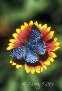 Bordered Patches (Chlosyne lacinia) can be found nectaring on Indian Blanket at Falcon State Park butterfly garden.