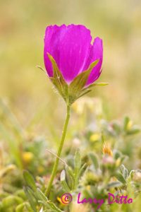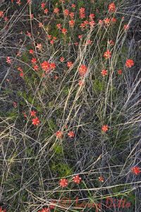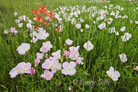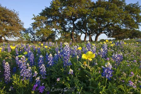 Wildflowers, mostly prickly poppy, blooming among mesquite trees in central Texas north of Fredericksburg, spring