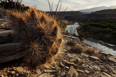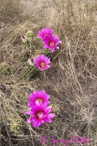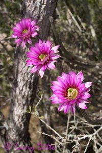Claret Cup Cactus (Echinocereus triglochidatus) on rocky dome, Enchanted Rock State Natural Area, Fredricksburg, Texas at sunset. Photographed in April from an angle to capture the blooms' shadows on the boulder behind them.