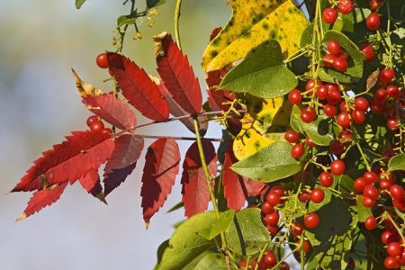 Honey Mesquite (Prosopis glandulosa) in the Texas hill country with spring Prickly Poppies and pepperweed.
