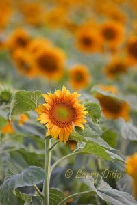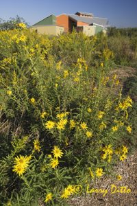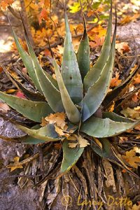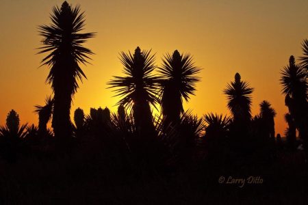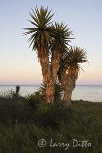 Aloe fields in bloom at sunset at Hilltop Gardens aloe farm near Harlingen, Texas. Headquarters, store and interpretive area on hilltop with palm trees.