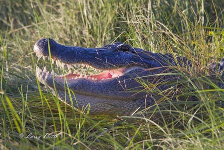 American Alligator (Alligator mississipiensis) floating amid water liliies, Texas Gulf Coast, summer